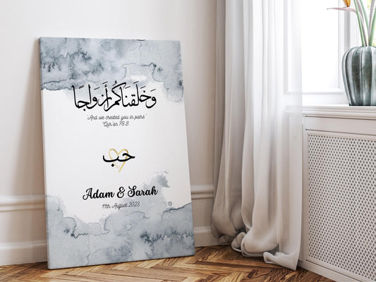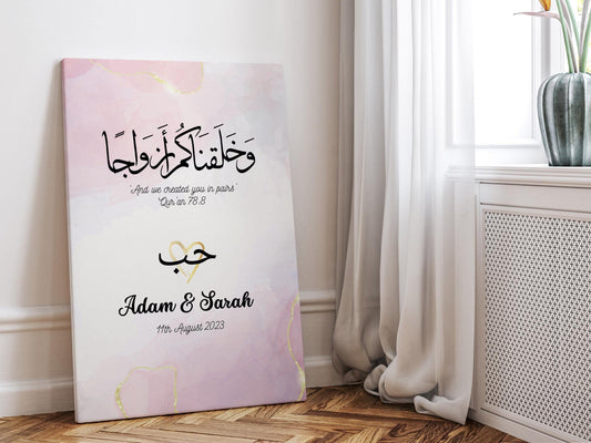 Personalized Couple Nikkah Canvas, Muslim Islamic Wedding Gifts, Custom Couple Name Calligraphy Arabic Art, and We Created you in Pairs